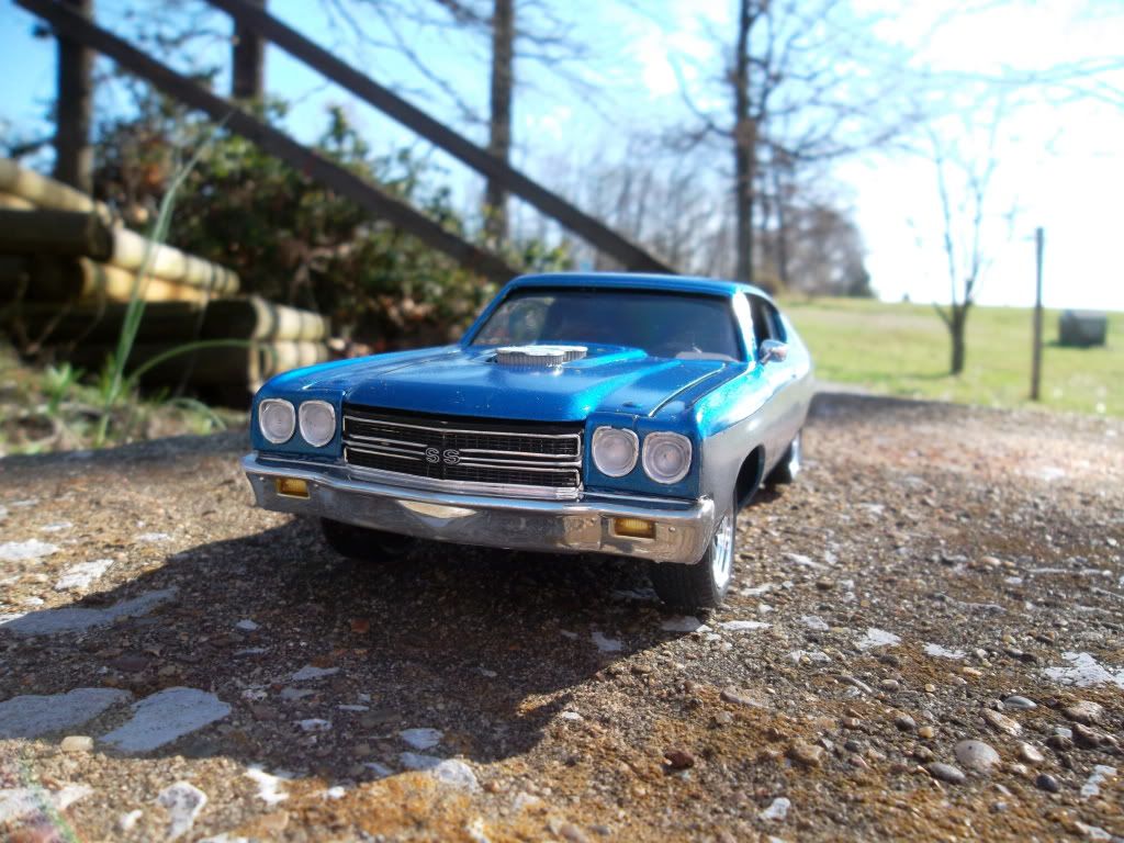 This is a amt malibu i built as a tribute to the passing of a mentor and friend. He passed a few months back and his wife gave me some of his things and had some misc parts and paints etc. The engine was one of the few pieces that I used to complete the build. The paint is blue saphire met over silver charcoal met, the wheels are from a revelle mustang kit. I had fun building this kit and using the misc parts from his collection of things....